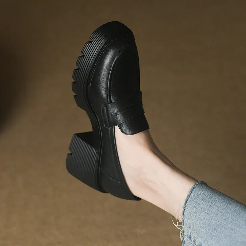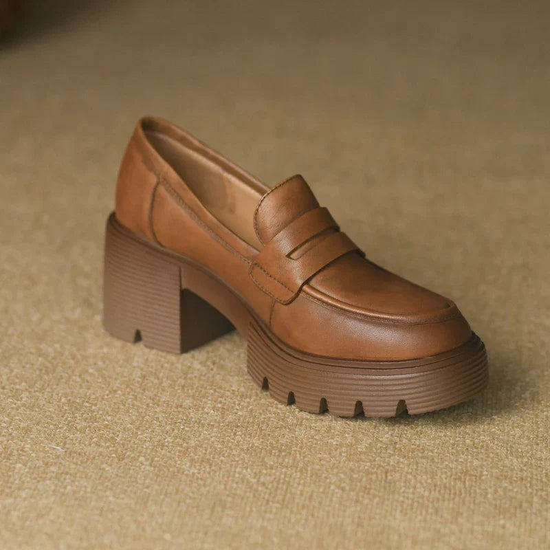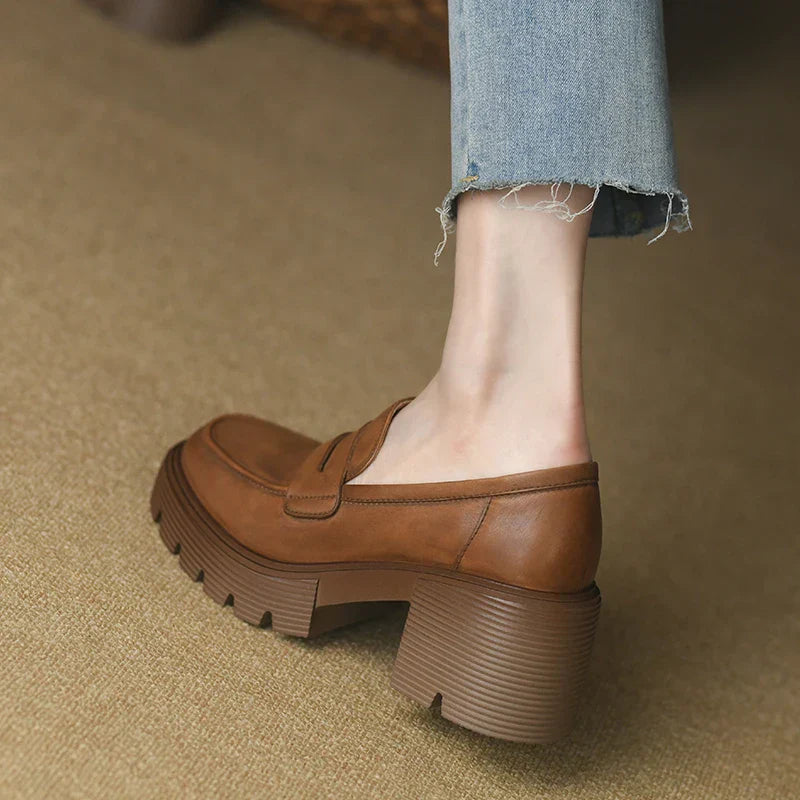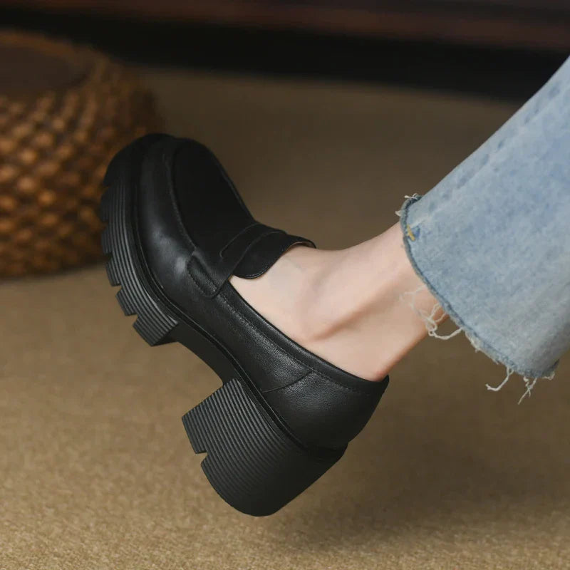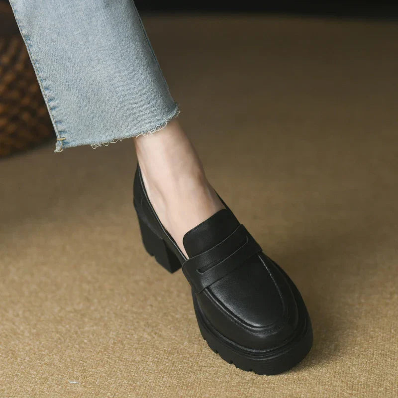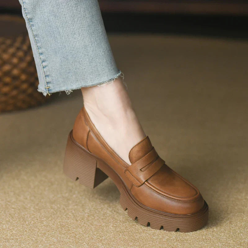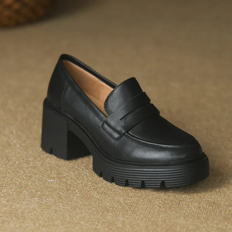 Explore o Virginia Sapato Feminino de Couro Plataforma, que une a elegância do estilo mocassim com um design contemporâneo. Este sapato em couro legítimo apresenta um salto quadrado de 7 cm, proporcionando uma altura sofisticada sem comprometer o conforto.